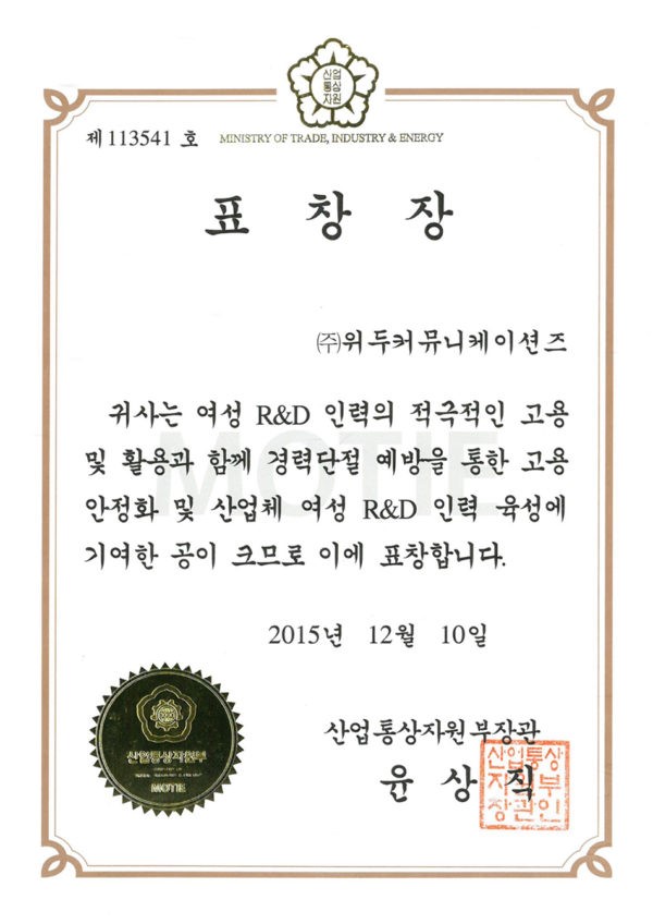 산업통상자원부 표창장 페이지 정보 작성자 WeDu 댓글 0건 조회 6,256회 작성일 19-05-30 19:34 본문 2015-12-10 표창장 제 113541호 여성 R&D 인력 고용 산업통상자원부장관 윤상직 List Previous서울클러스터 어워드 우수상 19.05.30 Next감사장 제 143호 19.05.30