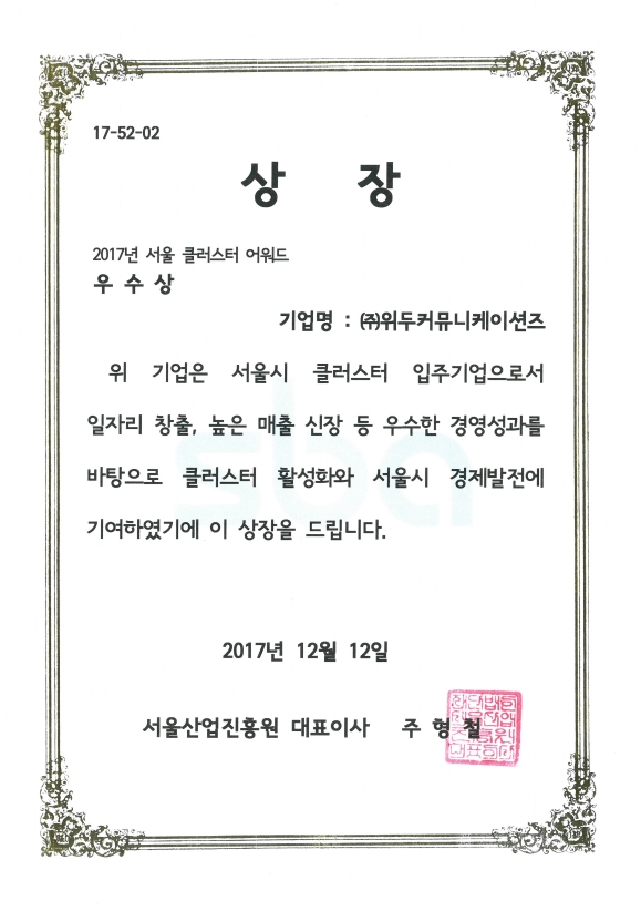서울클러스터 어워드 우수상 페이지 정보 작성자 WeDu 댓글 0건 조회 7,008회 작성일 19-05-30 19:34 본문 2017-12-12 우수상 17-52-02 서울클러스터 어워드 서울산업진흥원 대표이사 주형철 List Previous서울특별시장 표창장 19.05.30 Next산업통상자원부 표창장 19.05.30