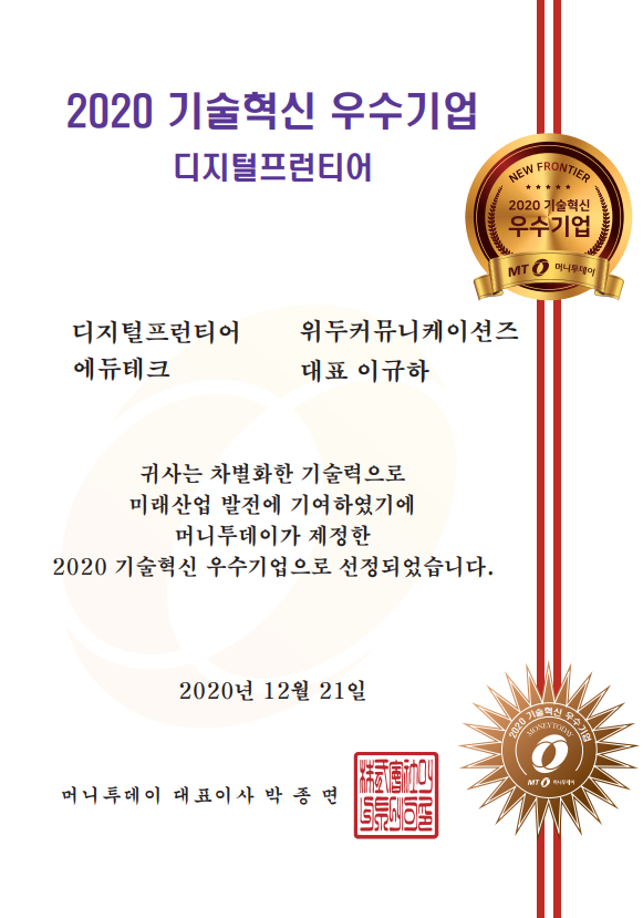 2020 기술혁신 우수기업 페이지 정보 작성자 WeDu 댓글 0건 조회 6,233회 작성일 21-12-31 12:58 본문 2020-12-21 2020 기술혁신 우수기업 디지털프런티어 에듀테크 머니투데이 대표이사 List Previous2020 소년한국 우수 어린이 도서 선정 21.12.31 Next2020 서울산업진흥원 2020 DMC어워드 21.12.31